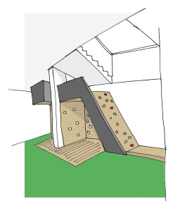Voor een basisschool met een sportprofiel stelde ik voor een klauterparcours aan te leggen. Een klimwand komt uit op een vliering. Van daaruit is er uitzicht over de hal. Een touwbrug naar de eerste verdieping en aan het einde een glijbaan. Het maakte enthousiasme los. Toch overheerste in tweede instantie de angst dat de uitdaging voor kinderen te groot zou worden. Misschien jammer, maar ook terecht. Dit was een brug te ver. De speelplekken zijn gebleven. De vliering wordt gebruikt om spullen op te bergen. De gedachte dat we dat sportprofiel mogen laten zien is gebleven. Daar wordt vast nog wat mee gedaan.