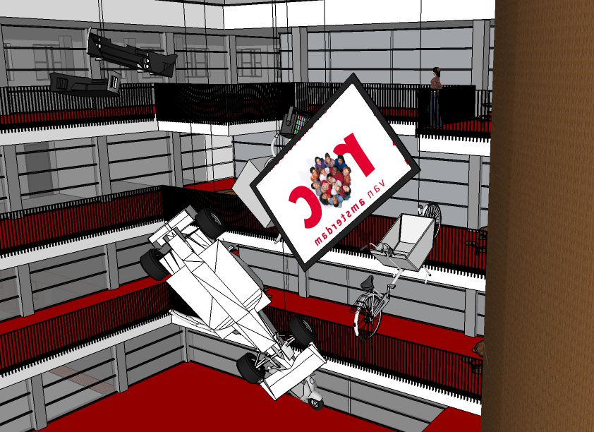 Het ROC van Amsterdam in de Tempelhofstraat in Amsterdam West heeft een imposant atrium. Ted Schulten architecten is druk doende de ruimtes rond dit atrium te verbouwen. Dankzij de knalrode steunkleur van de vloeren is het bepaald geen grauwe scholierenfabriek. Toch ontbrak volgens Ted bij binnenkomst iets. In de hal beneden staan een paar producten uit de technische werkplaats. Op de verdiepingen benadrukt het atrium de grote schaal van het gebouw. Je hoort nergens bij. Zo ontstond het idee om de trots van iedere opleiding in het atrium te hangen. Het maakt de vloer beneden vrij om te lopen en het maakt van het uitzicht op de verdiepingen een belevenis.