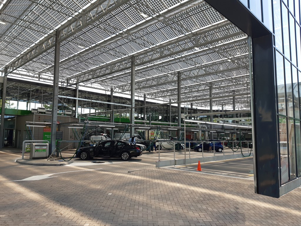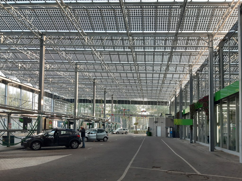 Comfort en duurzaamheid gaan vaker hand in hand dan je denkt. De autowasserette van Autoradam in Almere had op het binnenterrein een plein waarop je de eigen auto kan stofzuigen. ’s Winters was het er koud en winderig. ’s Zomers kon het er bloedheet worden. De directie van Autoradam wilde het plein daarom overkappen en voorzien van een interieurbaan. Daar zet je na de route door de wasstraat de auto op om het personeel van Autoradam ook de binnenkant van de auto schoon te laten maken terwijl jij iets bestelt bij de coffeecorner. Samen met de kassenbouwers van Nobutec ontwierpen we een overkapping met op het dak ruim 1700 m2 zonnepanelen. De panelen zijn semi-transparant zodat er gefilterd licht op het plein valt. Je staat nu droog op het plein, beschut voor de zon, met toch nog veel licht door het glas en ondertussen wekt het dak meer energie op dan de autowasserette verbruikt. Verduurzamen blijkt ook hier weer een win-win-situatie.